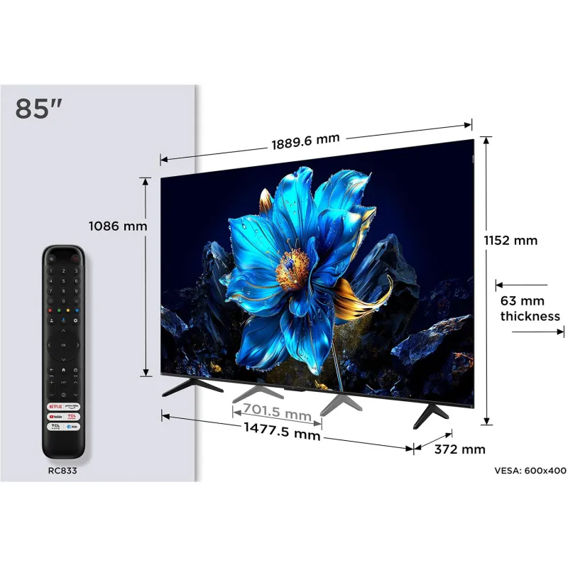 DISEÑO MODERNO Y FUNCIONALIDAD COMPLETA: Con un diseño sin marco y acabado metálico, el Televisor Tcl P7k 85P7K aporta un toque moderno a cualquier estancia. Incluye soporte de sobremesa y barra de sonido, lo que facilita su instalación y mejora la experiencia auditiva. Su interfaz VESA de 600 x 400 mm permite montarlo fácilmente en la pared. Además, su pantalla QLED 85 pulgadas y el potente procesador TCL AiPQ garantizan un rendimiento excepcional tanto en imagen como en sonido, siendo perfecto para quienes buscan un televisor de alta gama.