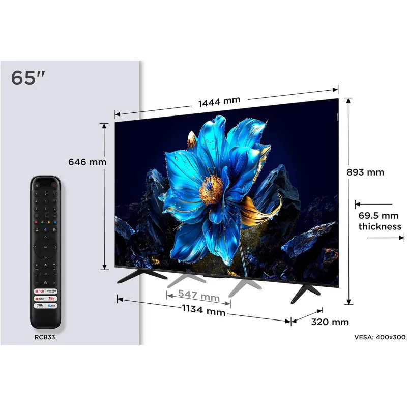 Televisor TCL 65P7K con tecnología QLED, resolución 4K Ultra HD y Google TV versión 12.0 para una experiencia visual avanzada. Tasa de refresco de 60Hz.