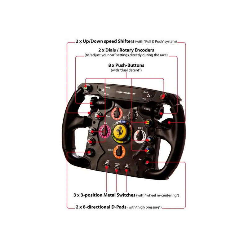 El Thrustmaster Ferrari F1 Wheel Add-On está pensado para simracing de monoplazas: más mandos frontales, layout tipo F1 y un conjunto centrado en ajustes rápidos. Si estás en ligas o haces stints largos, tener más acciones en el aro reduce cambios de pantalla y pérdidas de concentración.