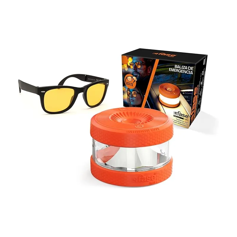 El pack incluye la baliza de emergencia V16 homologada conectada FaseLight y unas gafas para mejorar tu visibilidad al salir del vehículo a colocar la luz.
