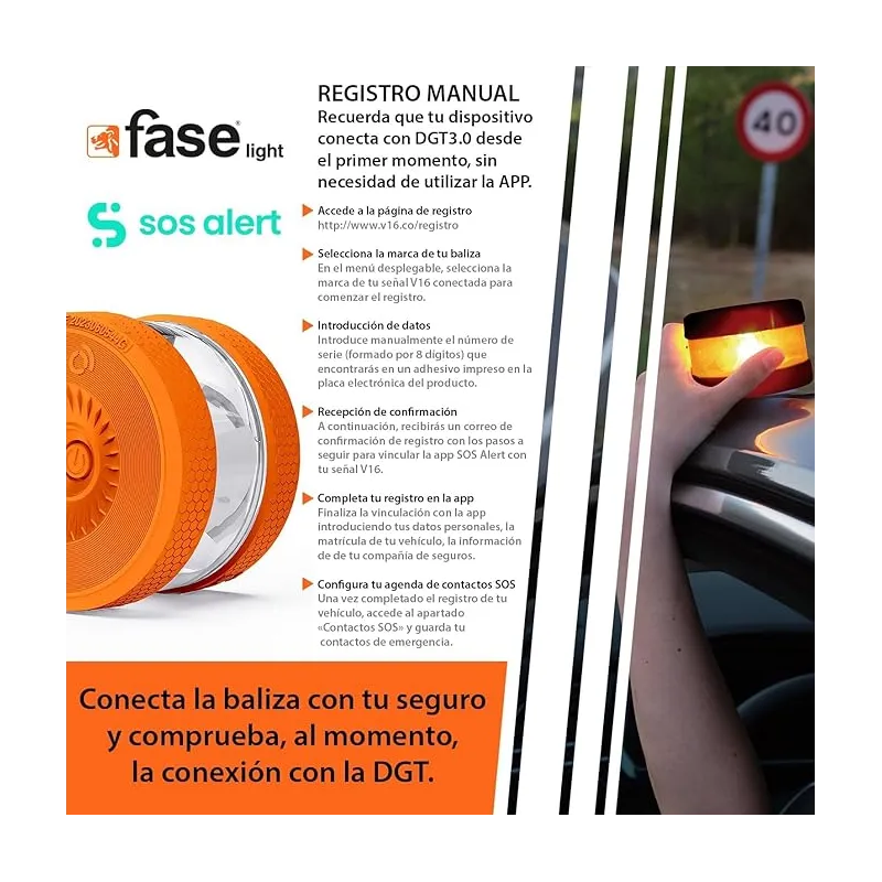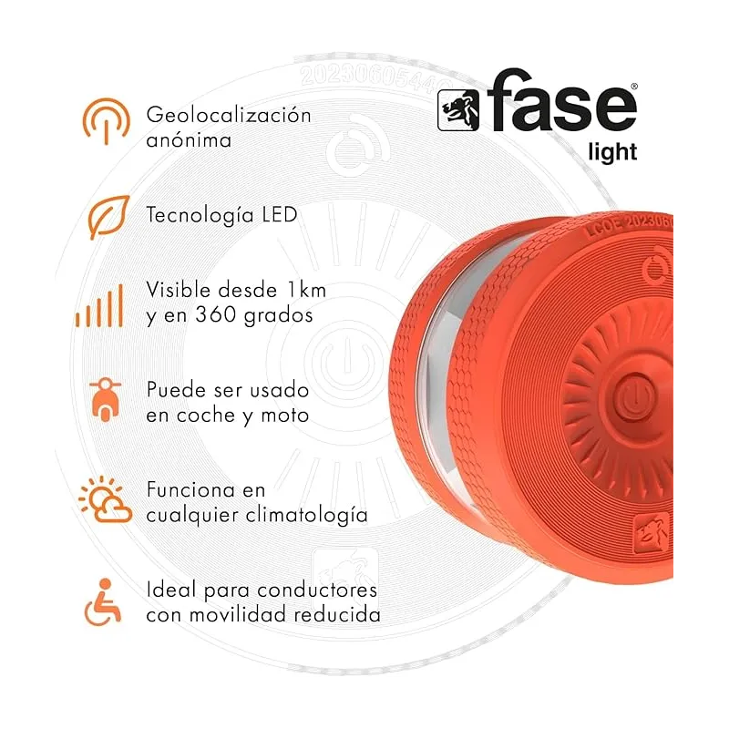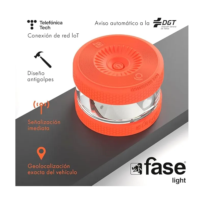 Al tratarse de una baliza de emergencia V16 conectada FaseLight, la unidad está preparada para integrarse en sistemas de aviso y facilitar la localización del vehículo inmovilizado, aportando una capa adicional de seguridad respecto a modelos no conectados.