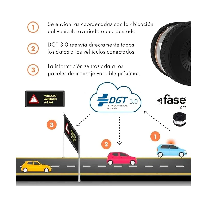 La conectividad FaseLight aporta capacidades avanzadas de aviso y localización del vehículo inmovilizado, lo que complementa la señal luminosa visible con información adicional para los servicios correspondientes.