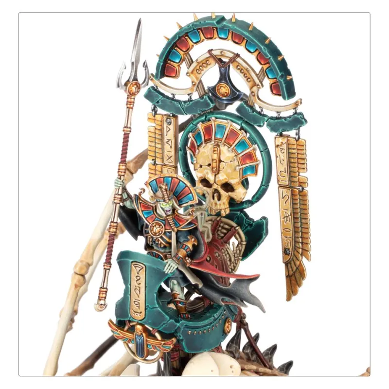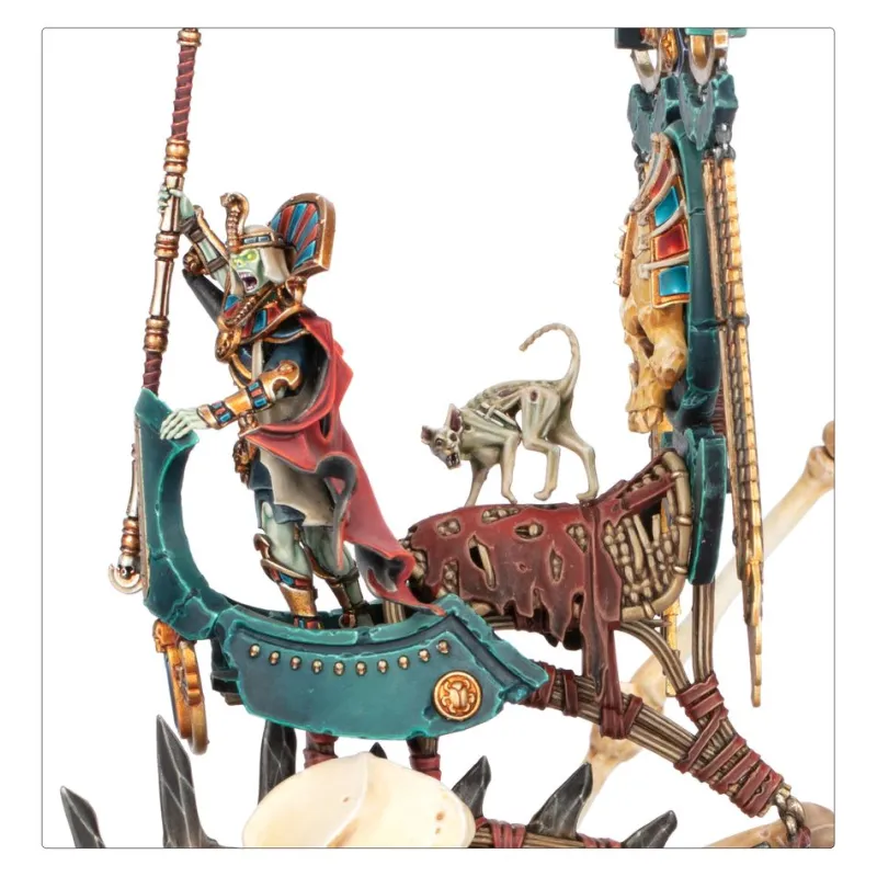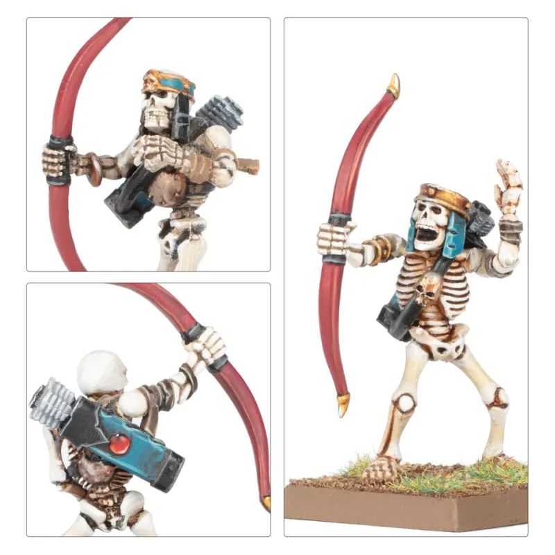 - Contiene: 1x Liche Priest en Necrolith Bone Dragon, 1x Rey Tumba, 40x Guerreros Esqueleto, 32x Arqueros Esqueleto, 16x Jinetes Esqueleto y 3x carros de esqueletos