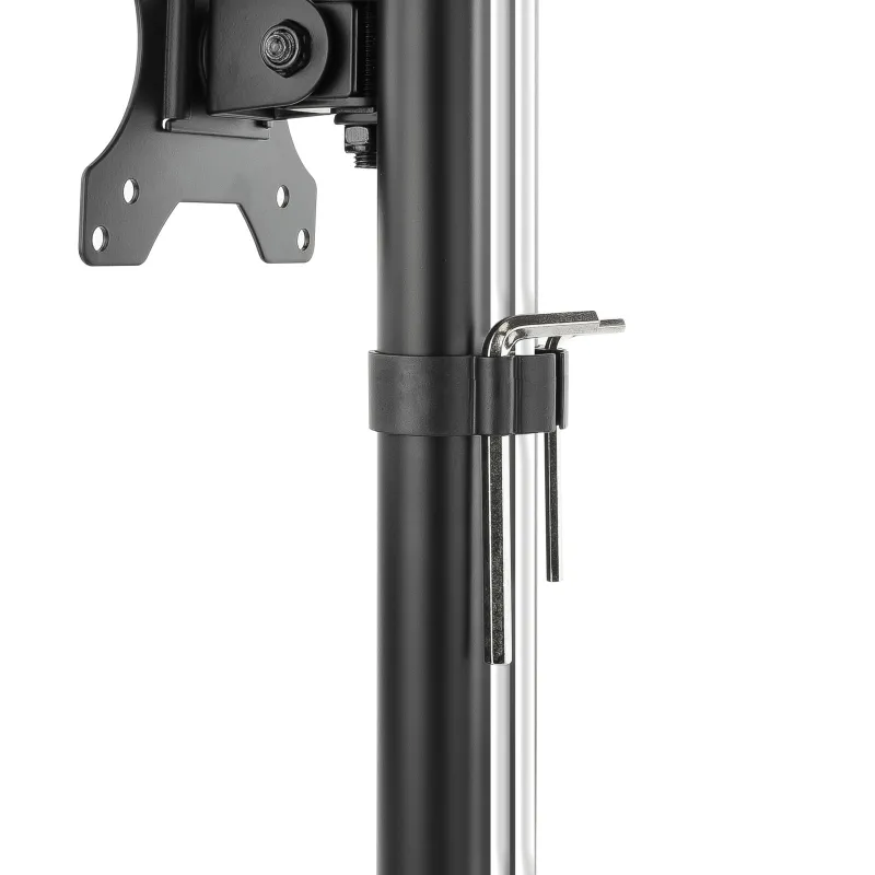 El soporte de montaje independiente es ideal para pantallas de 43,2 cm (17") a 68,6 cm (27"), con una capacidad máxima de peso de 6 kg. Compatible con interfaces de montaje de 75 x 75 mm y 100 x 100 mm, soporta una única pantalla, haciendo que sea perfecto para configuraciones de escritorio.