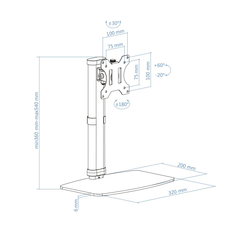 Destaca por su ergonomía, ofreciendo ajustes de altura manual que van desde 360 mm hasta 540 mm, permitiendo una inclinación de -20° a 60° y un ángulo de deriva de 60°. Además, la bandeja se ajusta de -180° a 180°, facilitando una personalización completa de la posición de la pantalla.
