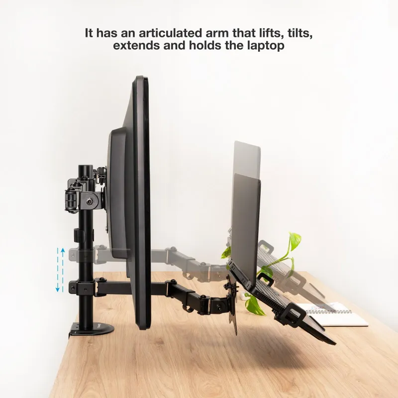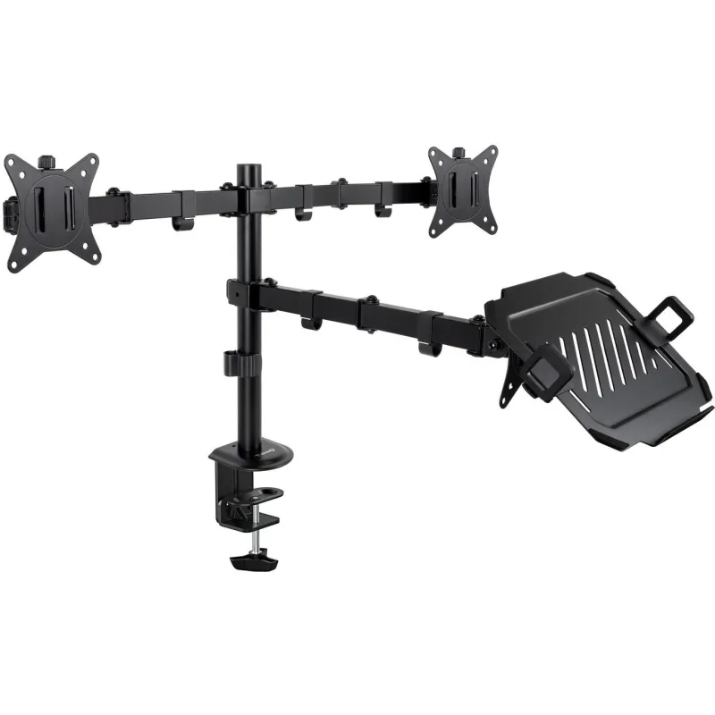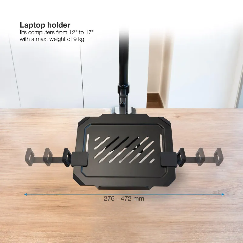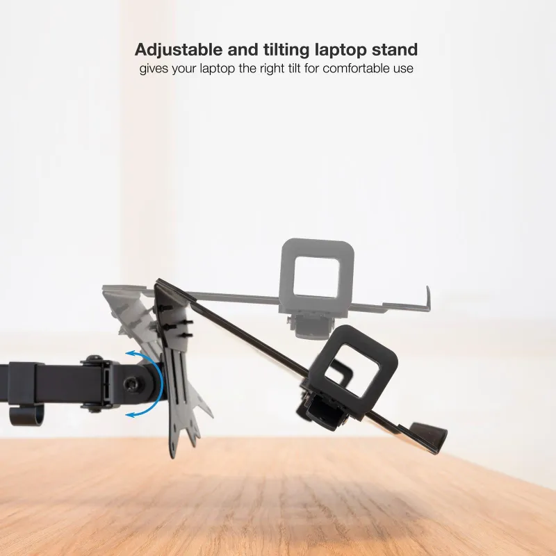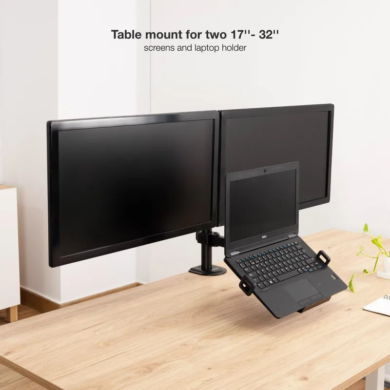 SOPORTE DE MESA PARA 2 PANTALLAS DE 17’’-32” Y BANDEJA PARA PORTÁTIL: Si eres de los que piensan que dos pantallas se acaban quedando cortas, te presentamos nuestro nuevo soporte con dos brazos articulados y soporte para portátil. Configura a tu gusto, trabaja a tu gusto.