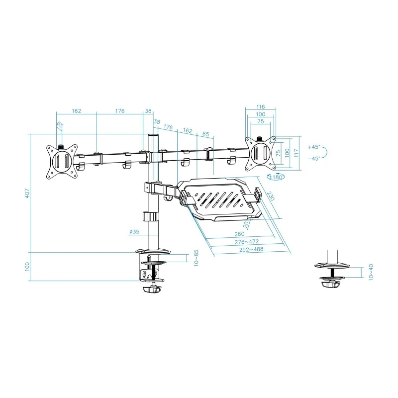 El diseño permite una instalación versátil mediante abrazadera o atornillado en escritorios con un grosor de hasta 8,5 cm. Fabricado en acero y de color negro, garantiza durabilidad y elegancia. La ergonomía es destacable con un ángulo de inclinación de -45° a 45°, ángulo de giro de -90° a 90° y ángulo de rotación de 180°, además de incluir gestión de cables para un espacio de trabajo ordenado.