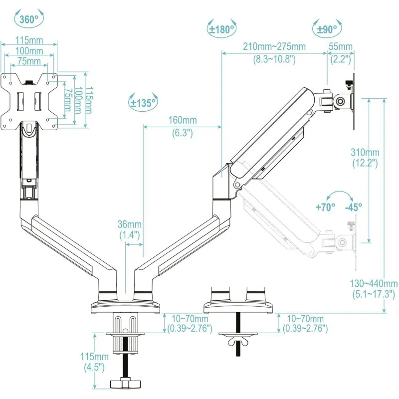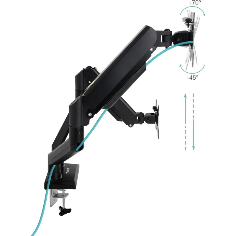 BRAZO CON RESORTE DE GAS PARA AJUSTES PRECISOS: Gracias a su brazo con resorte de gas, este soporte permite un ajuste de altura suave y preciso de hasta 440 mm, adaptándose a diferentes necesidades ergonómicas. Además, su capacidad de inclinación de -45° a 70° y giro de 180° proporciona una experiencia de visualización óptima. Su sistema de gestión de cables ayuda a mantener un espacio de trabajo limpio y organizado.