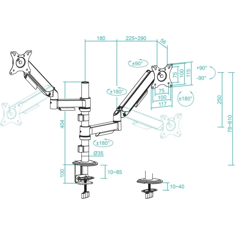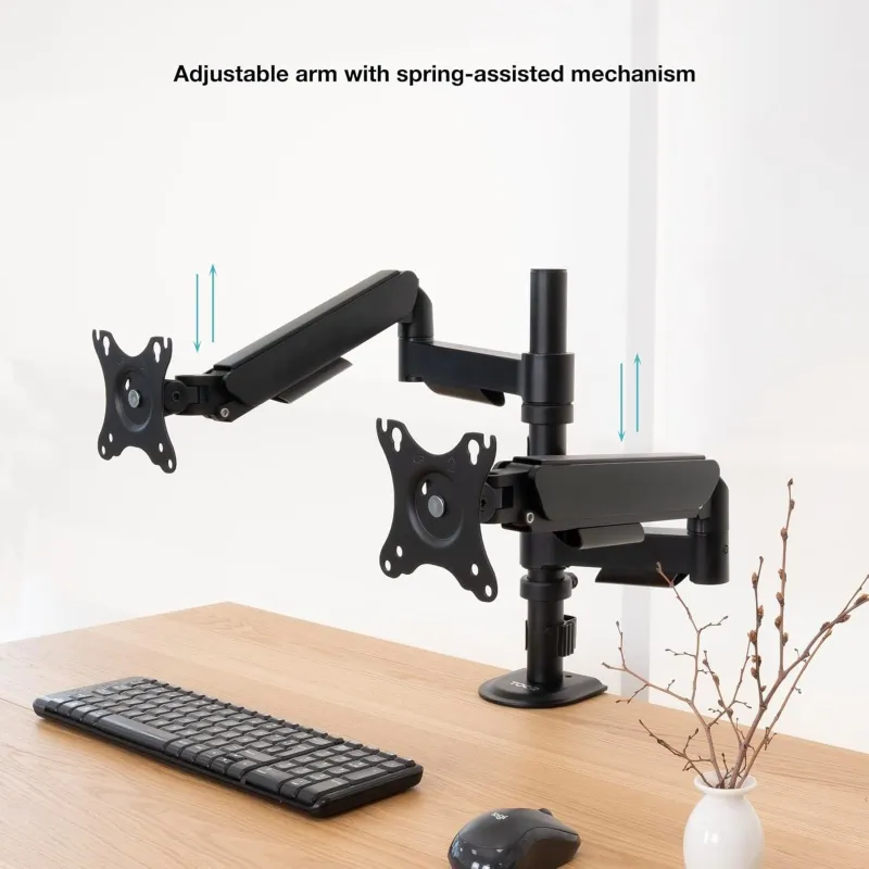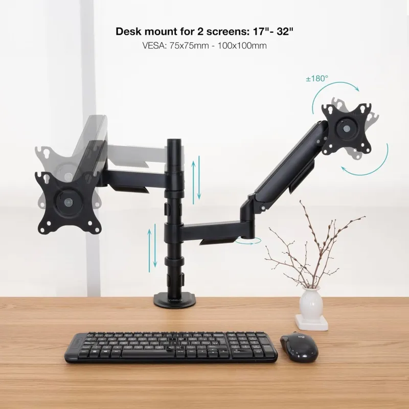 Soporte de Mesa Tooq DB1533TNR-B con ajuste de altura con resorte de gas, ángulo de rotación 360° y capacidad para dos pantallas de hasta 32 pulgadas