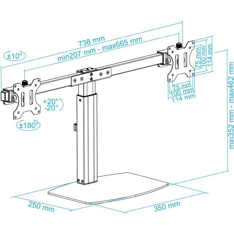 La ergonomía es uno de sus puntos fuertes, ofreciendo ajustes de altura entre 352 y 462 mm, así como un ángulo de inclinación de -10 a 10° y un ángulo de giro de -20 a 20°. Además, cuenta con una rotación de 180°, lo que te permite colocar tus pantallas en la posición más cómoda y eficiente para ti.