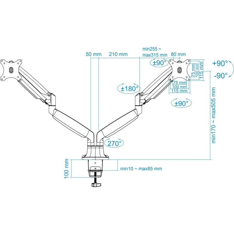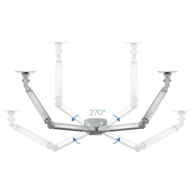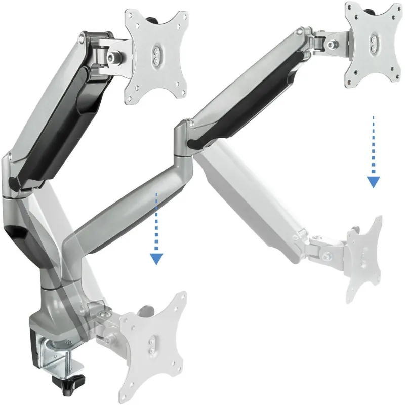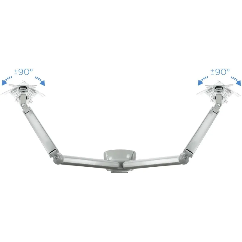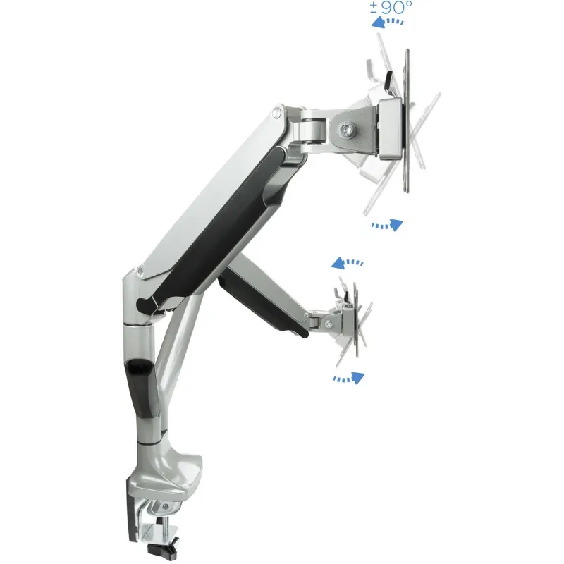 AJUSTE PERFECTO: En cuanto a ergonomía, ofrece una flexibilidad sin precedentes. Con un ángulo de inclinación que varía entre -90° y 90°, un ángulo de giro de 180° y una rotación completa de 360°, cada pantalla puede ser ajustada a la perfección para cumplir con las necesidades específicas del usuario. El resorte de presión a gas incorporado asegura movimientos suaves y precisos, facilitando el ajuste en cualquier momento y con el menor esfuerzo posible.