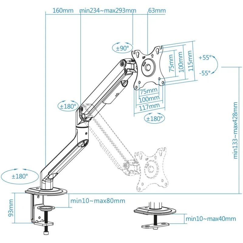 La ergonomía es una prioridad con ajustes de altura mediante resorte de gas, ofreciendo un rango de 133 mm a 428 mm. Los amplios ángulos de inclinación y giro, de -55° a 55° y -90° a 90° respectivamente, junto con una rotación y deriva de 180°, proporcionan una máxima flexibilidad para un posicionamiento perfecto. Además, la gestión de cables integrada mantiene tu espacio ordenado y libre de desorden.
