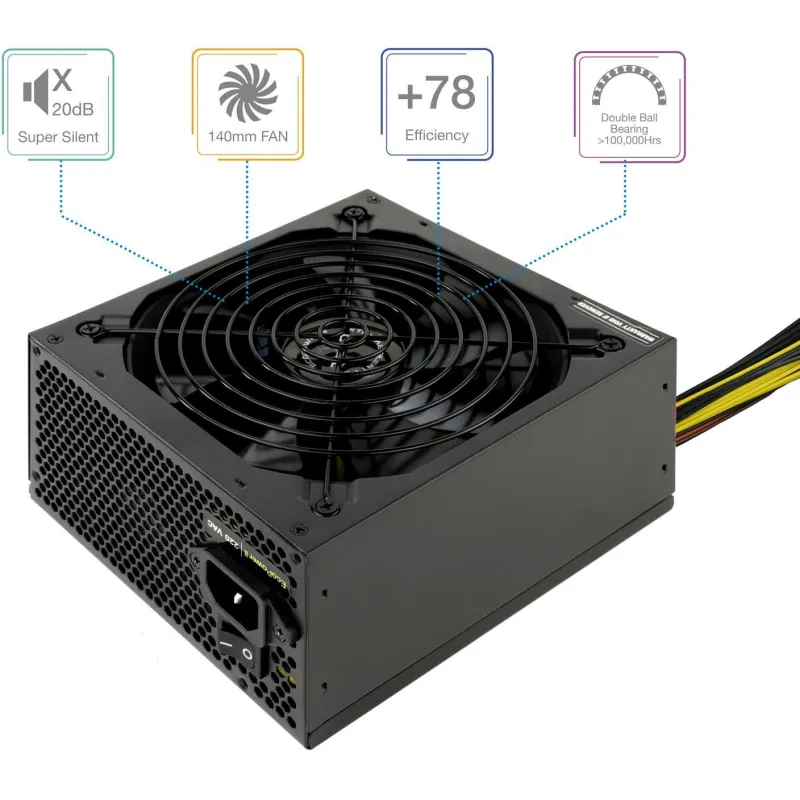 Esta fuente de alimentación de 650 W es ideal para proporcionar energía estable y eficiente a tu sistema. Con un voltaje de entrada AC de 220 V y una eficiencia del 83%, garantiza un rendimiento óptimo. La corrección del factor de potencia activa (PFC) y las diversas funciones de protección de poder como sobreintensidad, sobrevoltaje, sobrecalentamiento, sobrecarga y bajo voltaje, aseguran la seguridad y durabilidad de tu equipo.