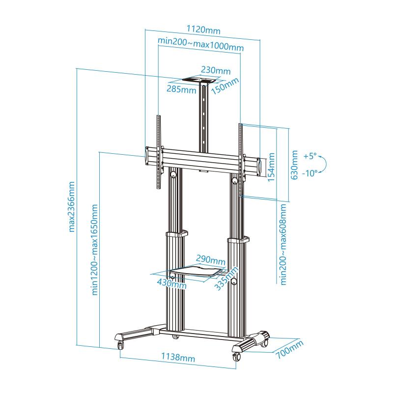 Además, ofrece la posibilidad de ajustar la inclinación de la pantalla en un ángulo de -10° a 5°, permitiendo una experiencia de visualización óptima desde diferentes perspectivas. La estructura se sostiene sobre cuatro ruedas robustas, de las cuales se pueden bloquear para garantizar una estabilidad adicional cuando sea necesario. Con una compatibilidad de montaje que abarca desde 200 x 200 mm hasta 1000 x 600 mm, es compatible con una amplia gama de pantallas y monitores.
