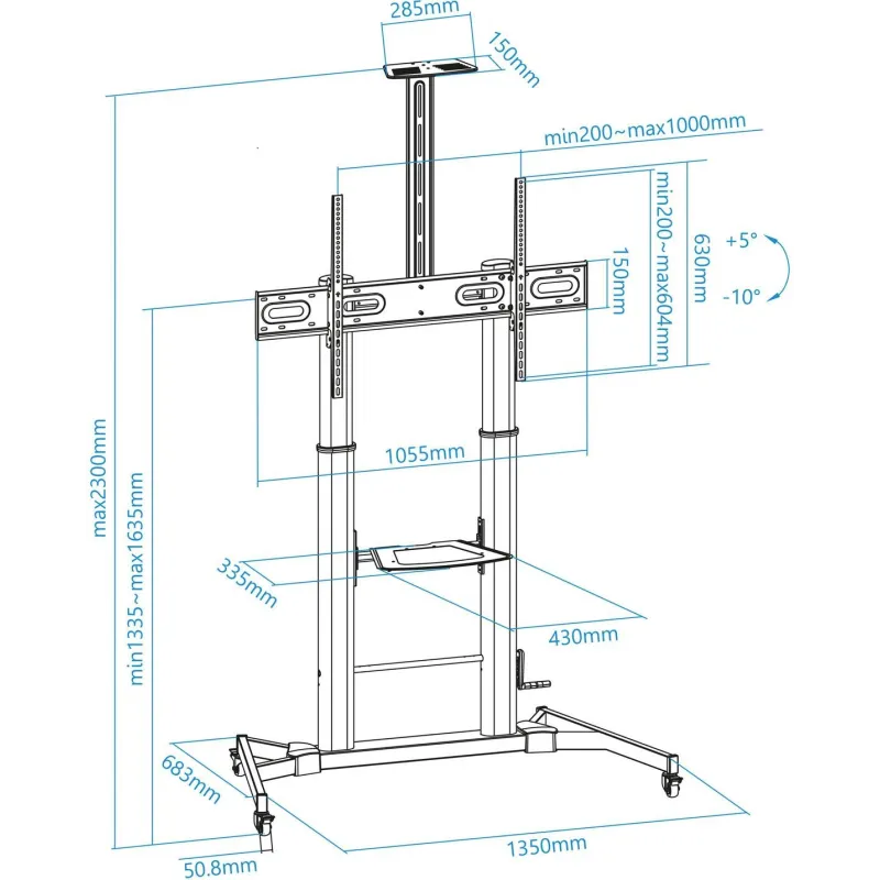 El soporte de piso para pantallas ofrece una solución robusta y versátil para montajes de grandes dimensiones. Compatible con pantallas de 152,4 cm (60") a 2,54 m (100"), soporta un peso máximo de 100 kg. Su diseño ergonómico permite ajustes manuales de altura en un rango de 1335 a 1635 mm, proporcionando una experiencia de visualización óptima gracias a su capacidad de inclinación de -10 a 5°.