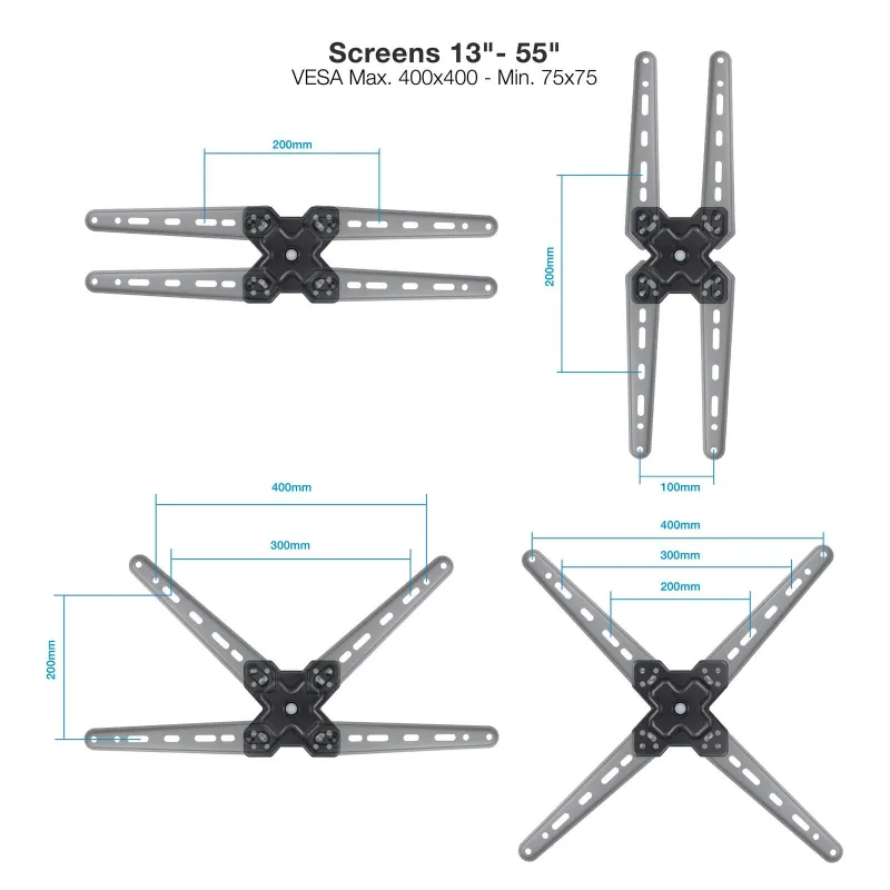 COMPATIBILIDAD UNIVERSAL: La interfaz de montaje se adapta a una variedad impresionante de tamaños, desde 75 x 75 mm hasta 400 x 400 mm. Esto significa que no importa la marca o el modelo de tu pantalla, siempre tendrás la certeza de una instalación segura y compatible. La versatilidad del montaje incluye opciones de 75 x 75, 100 x 100, 100 x 200, 200 x 100, 200 x 200, 300 x 200, 300 x 300, 400 x 200, 400 x 400 y 400 x 300 mm.