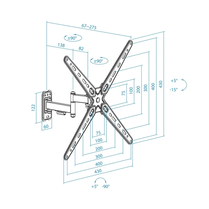 AJUSTE ERGONÓMICO PERFECTO: Con un ángulo de inclinación de -15 a 5 grados y un giro que alcanza los -90 a 90 grados, este producto permite ajustar la pantalla a la posición más cómoda para el usuario. La función de rotación y la gestión de cables integrada aseguran una experiencia visual sin desorden. La distancia ajustable a la pared, que varía de 6,7 cm a 27,5 cm, proporciona un despliegue limpio y eficiente.