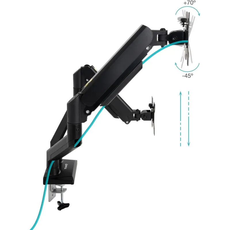 Fabricado en acero de alta calidad, el Soporte Tooq LP1434TNR-B ofrece una estructura sólida y duradera capaz de soportar un uso intensivo. Su diseño robusto garantiza la seguridad de los monitores, incluso cuando se utilizan en posiciones elevadas o con ángulos pronunciados. El resorte de gas mantiene una tensión constante para evitar movimientos no deseados, mientras que el sistema de pinza o atornillado asegura una fijación firme al escritorio. Este soporte está diseñado para ofrecer una experiencia de uso confiable a largo plazo. La rotación de 360° y los ajustes de inclinación y giro se mantienen estables gracias a su construcción precisa. Con una estética cuidada y materiales resistentes, este soporte es ideal tanto para oficinas como para estaciones de trabajo domésticas que requieren una solución profesional.
