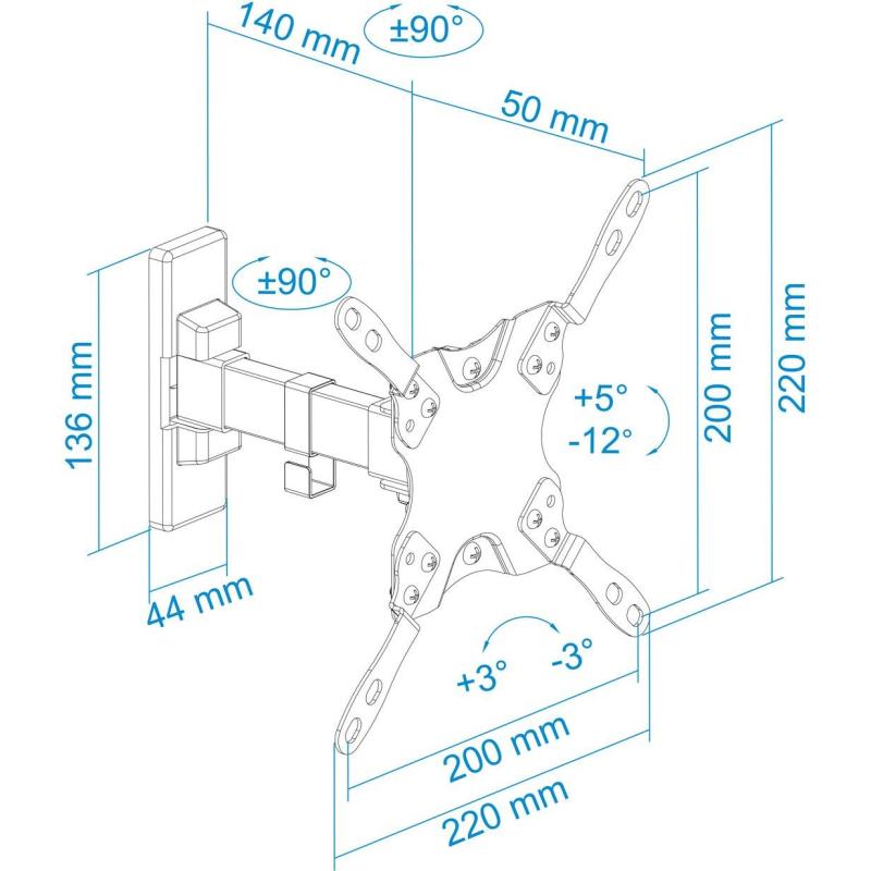 CARACTERÍSTICAS Y ESTÁNDARES: Soporte vertical de fijación en pared para pantallas planas de 13" a 42" y hasta un máximo de 20kg de peso. Permite configurar la inclinación de -12º ~ +5º sobre el plano vertical y con un ángulo de giro de 180º sobre el plano horizontal. Compatible con los formatos de fijación de pantalla VESA 75x75, 100x100, 200x100 Y 200x200 mm.