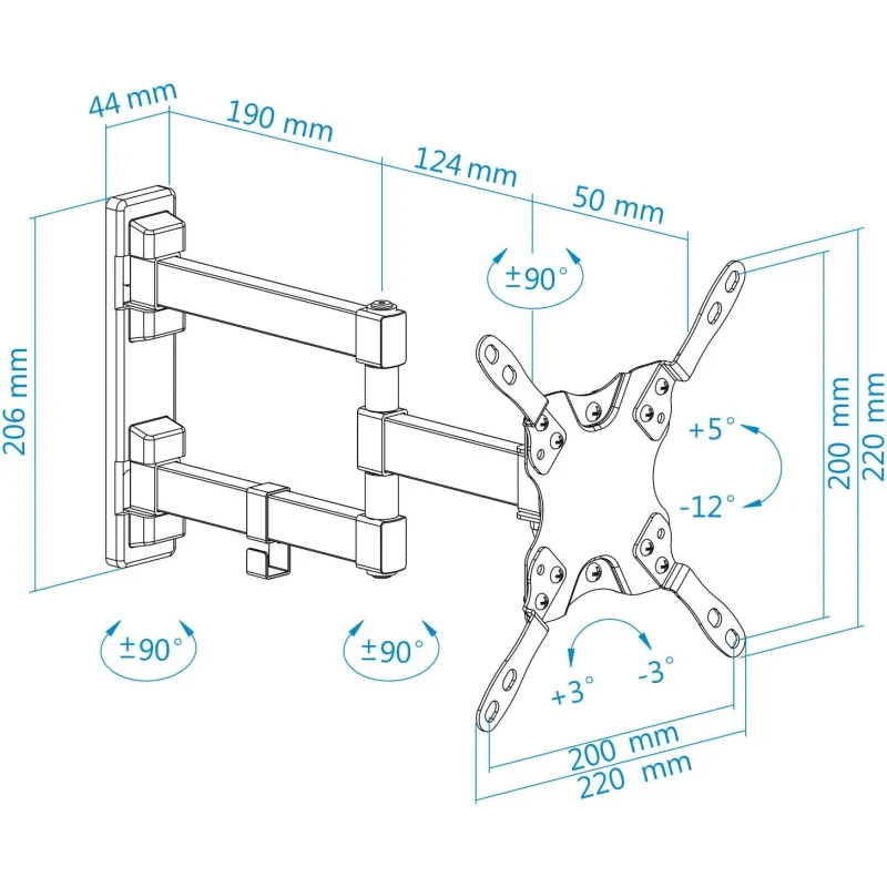 Este soporte de montaje de pared es ideal para pantallas de 33 cm (13") hasta 106,7 cm (42") y soporta un peso máximo de 20 kg. Es compatible con varias interfaces de montaje, desde 75 x 75 mm hasta 200 x 200 mm, lo que lo hace versátil para diferentes tamaños de pantallas.