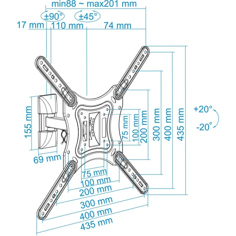 Este soporte de pared para pantallas se adapta a una amplia variedad de tamaños, desde 23" hasta 55", y soporta un peso máximo de 30 kg. Su compatibilidad con múltiples interfaces de montaje, desde 75 x 75 mm hasta 400 x 400 mm, asegura una instalación flexible y segura para tu pantalla. Con un ángulo de inclinación ajustable de -20° a 20° y una rotación de 90°, permite posicionar la pantalla en la orientación más adecuada para tu comodidad visual.