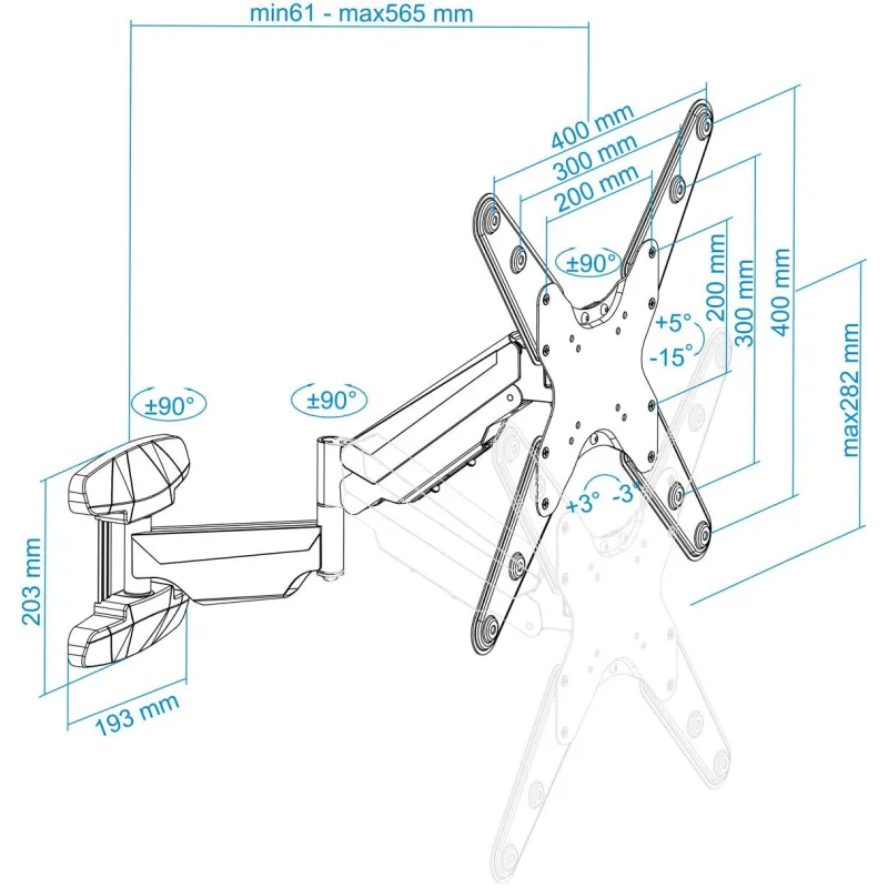 El soporte de montaje de pared es ideal para televisores y monitores con un tamaño de pantalla mínimo de 58,4 cm (23") y un tamaño máximo de 139,7 cm (55"), soportando hasta 30 kg de peso. Compatible con diversas interfaces de montaje, desde 75 x 75 mm hasta 400 x 400 mm, permite una instalación segura y versátil.