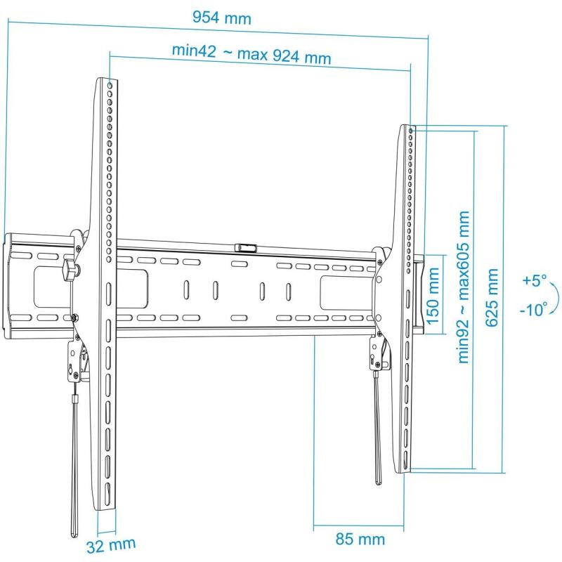 El tipo de montaje es de pared y permite un ángulo de inclinación ajustable entre -10° y 5°. La distancia máxima de la pared es de 8,5 cm.