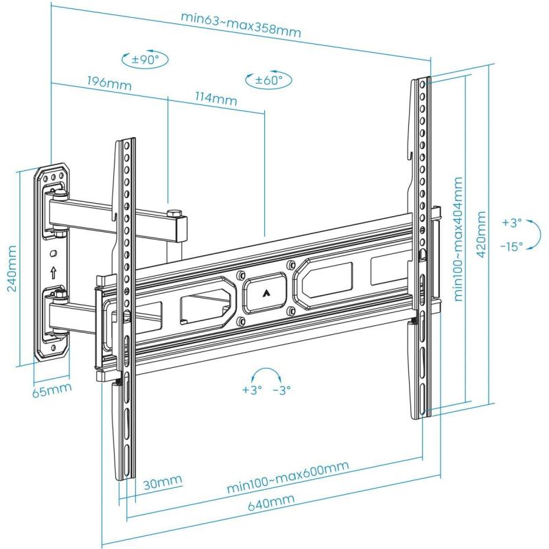 Este versátil mecanismo permite ajustar la profundidad y la inclinación, con un ángulo de inclinación que varía entre -15° y 3°, y un ángulo de giro de -60° a 60°. Además, cuenta con un nivel integrado y es compatible con pantallas curvas, asegurando una instalación precisa y flexible. La distancia a la pared puede ajustarse entre 6,3 cm y 35,8 cm, ofreciendo una excelente ergonomía y adaptabilidad.