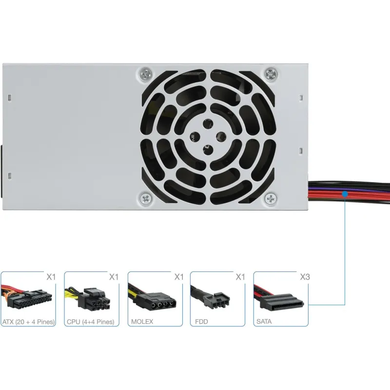 Diseñada para PCs, cumple con la versión ATX 1.3 y opera a un nivel de ruido de solo 20 dB, lo que la hace extremadamente silenciosa. Su ventilador de 8 cm ubicado en la parte superior y el sistema de enfriamiento activo aseguran una óptima disipación del calor.