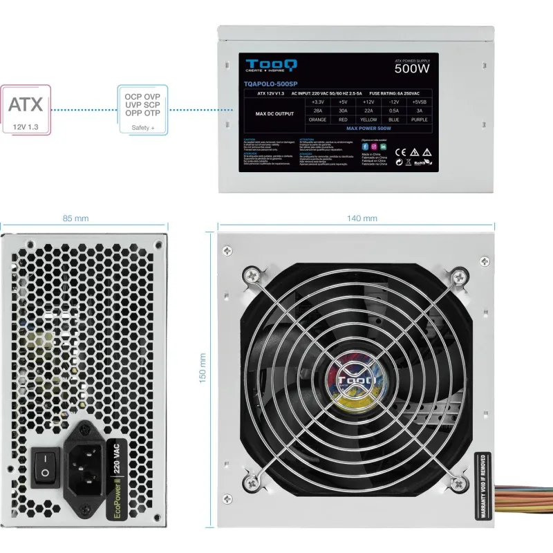 Esta fuente de alimentación ofrece una potencia total de 500 W y es compatible con una entrada AC de 220 V con una frecuencia de 50-60 Hz. Gracias a su corrección del factor de potencia activa (PFC), asegura una eficiencia energética óptima. Proporciona una corriente máxima de salida de 28 A para +3.3V, 22 A para +12V, 30 A para +5V y cuenta con múltiples funciones de protección como sobreintensidad, sobretensión, sobrevoltaje, sobrecalentamiento, cortocircuito y bajo voltaje.
