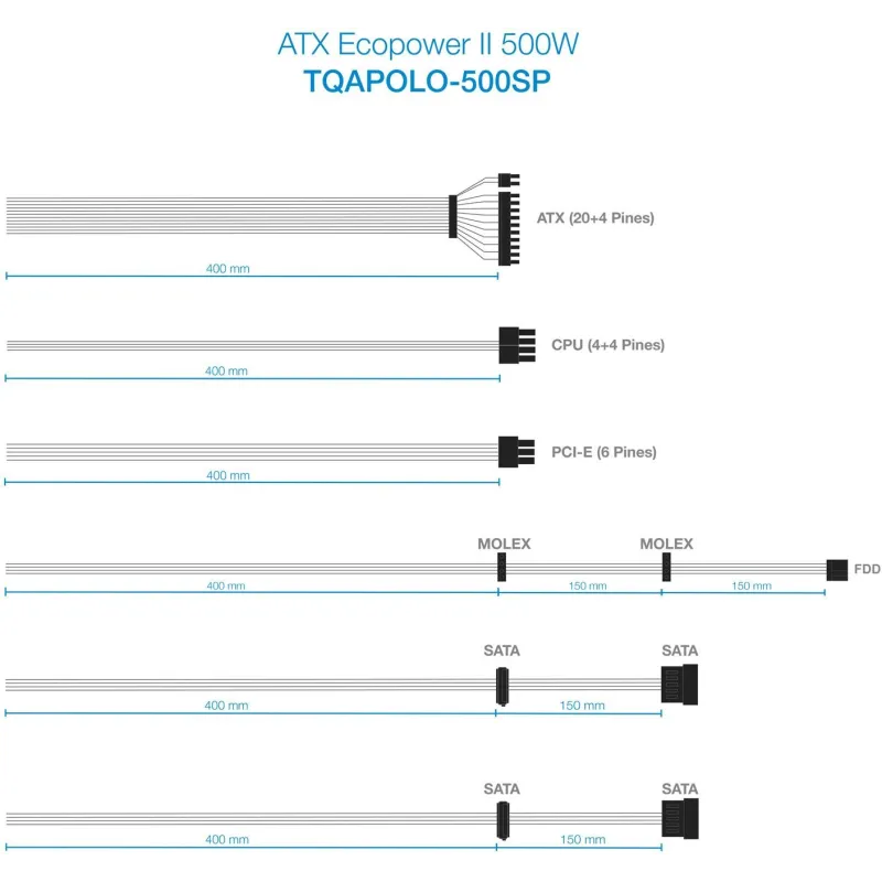 CONEXIONES VERSÁTILES: Equipado con un alimentador de energía para tarjeta madre de 20+4 pines ATX y un conector de alimentación EPS de 4+4 pines, es compatible con una amplia variedad de configuraciones. Los cuatro conectores de energía SATA y los dos conectores de poder periféricos (Molex) permiten una integración sencilla con múltiples dispositivos, ofreciendo una longitud de cable de hasta 70 cm para mayor alcance y flexibilidad.