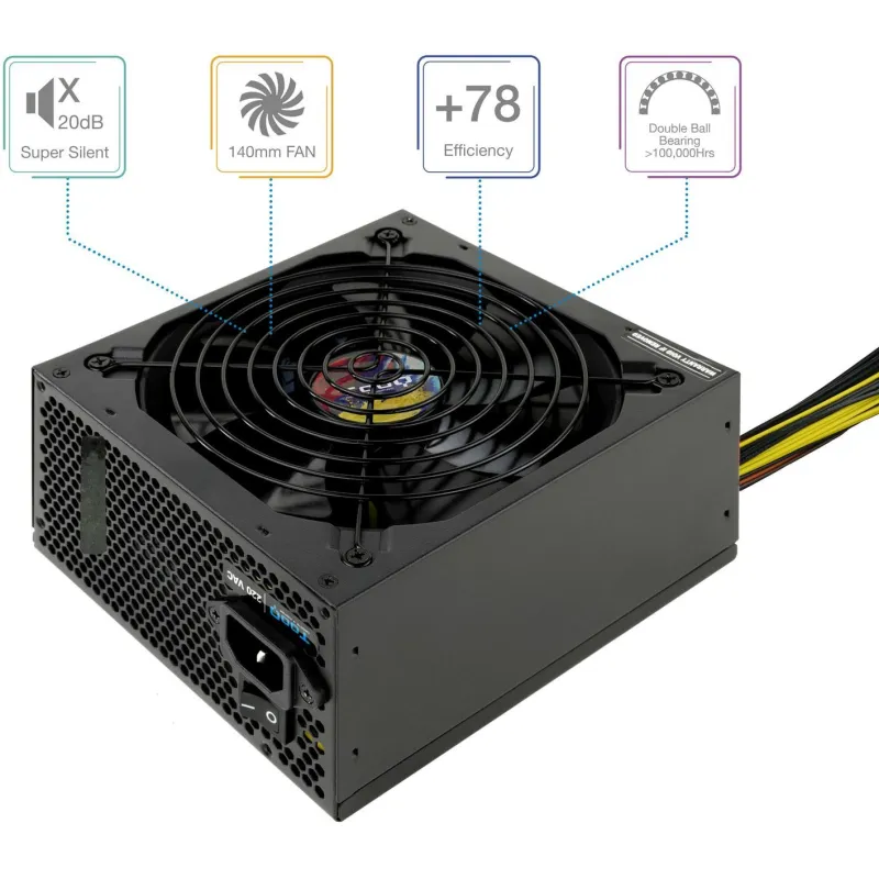 Esta fuente de alimentación de 650 W es ideal para mantener tu sistema funcionando de manera eficiente y segura. Con un voltaje de entrada AC de 220 V y una frecuencia de entrada AC de 50 - 60 Hz, se adapta perfectamente a la mayoría de los entornos eléctricos. Su corrección del factor de potencia tipo (PFC) activo asegura una mayor eficiencia energética.