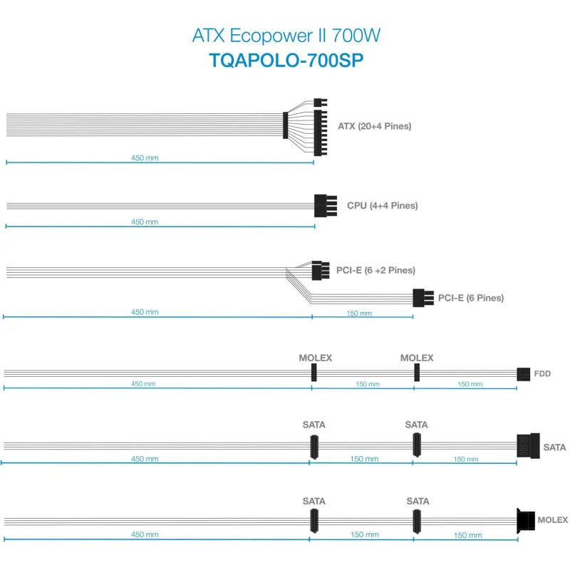 VERSATILIDAD EN CONEXIONES: Equipado con un alimentador de energía para tarjeta madre de 20+4 pines ATX y una longitud de cable de 45 cm, se adapta a una amplia gama de configuraciones. Los cinco conectores de energía SATA de 700 mm de longitud permiten una conexión sencilla y ordenada de múltiples discos duros y unidades SSD. Para dispositivos periféricos, cuenta con tres conectores Molex de 750 mm. Además, incluye un conector PCI Express de 6 pines y otro de 6+2 pines, ambos con cables de 60 cm, así como conectores CPU P4 de 4 pines y CPU de 4+4 pines, con una longitud de 45 cm, asegurando compatibilidad con las CPU más exigentes.