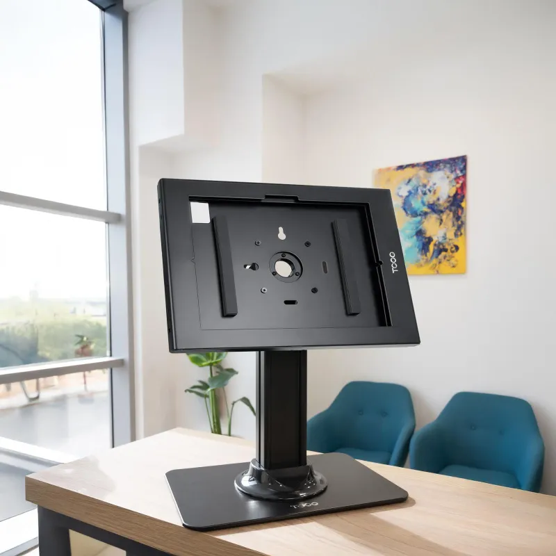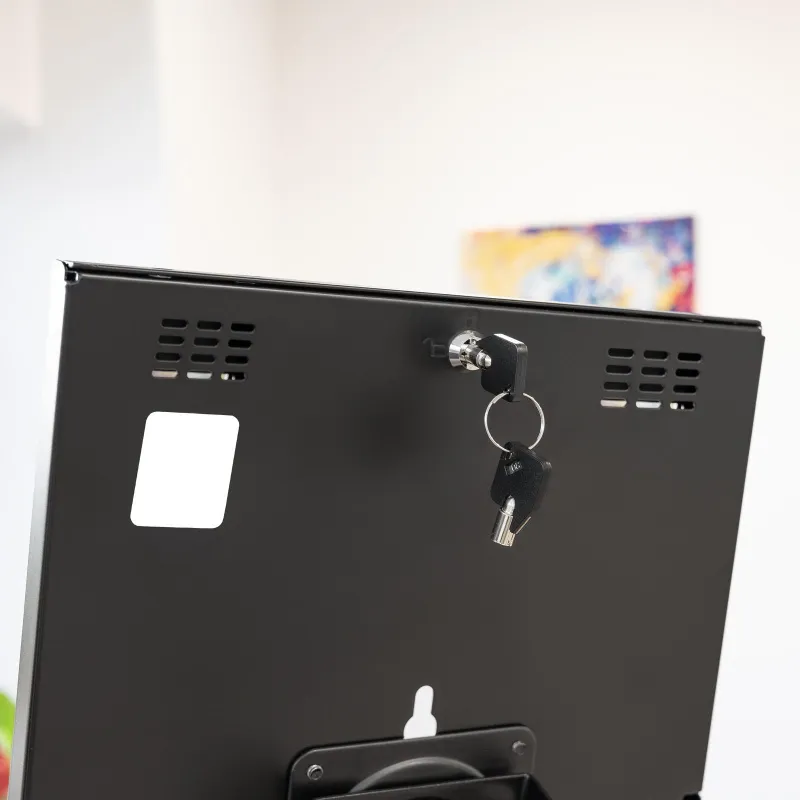 Cuando una tablet hace de mostrador digital o punto de consulta, el problema suele ser el mismo: que no se mueva y que no desaparezca. Este marco resuelve esa parte con cerradura a llave y estructura de acero.