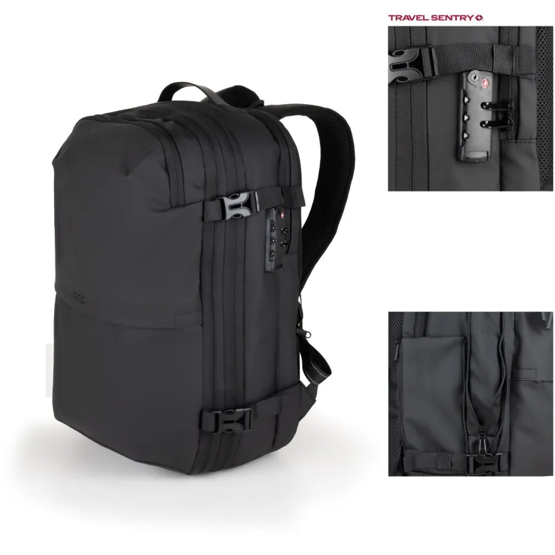 Para moverte entre terminales y estaciones, el acople para maleta (cinta trasera para trolley) evita cargar todo el peso en los hombros. El candado antirrobo añade un cierre con combinación cuando dejas la mochila en bandejas o zonas comunes.