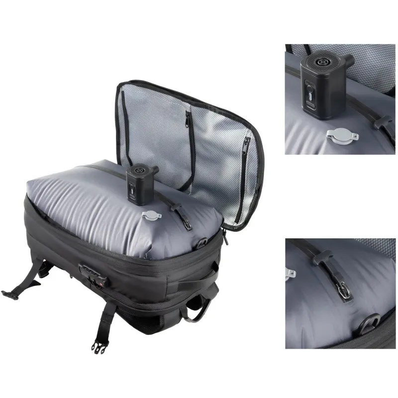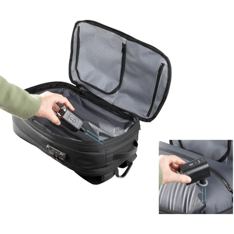 Si llevas ropa y quieres reducir bulto, entonces la compresión es el “truco” que marca la diferencia. Metes las prendas en el compartimento, cierras y usas la bomba de aire eléctrica para sacar el aire hasta compactar.