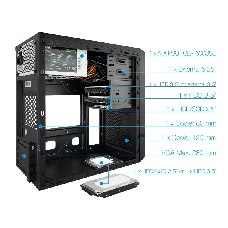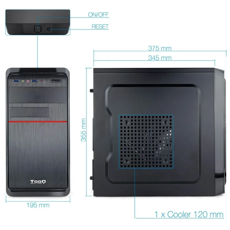 DIMENSIONES COMPACTAS: Con un ancho de 178 mm, una profundidad de 365 mm y una altura de 355 mm, esta torre Mini Tower es ideal para espacios reducidos sin comprometer la capacidad ni el rendimiento. Su diseño compacto facilita la instalación en cualquier entorno, optimizando el espacio disponible.