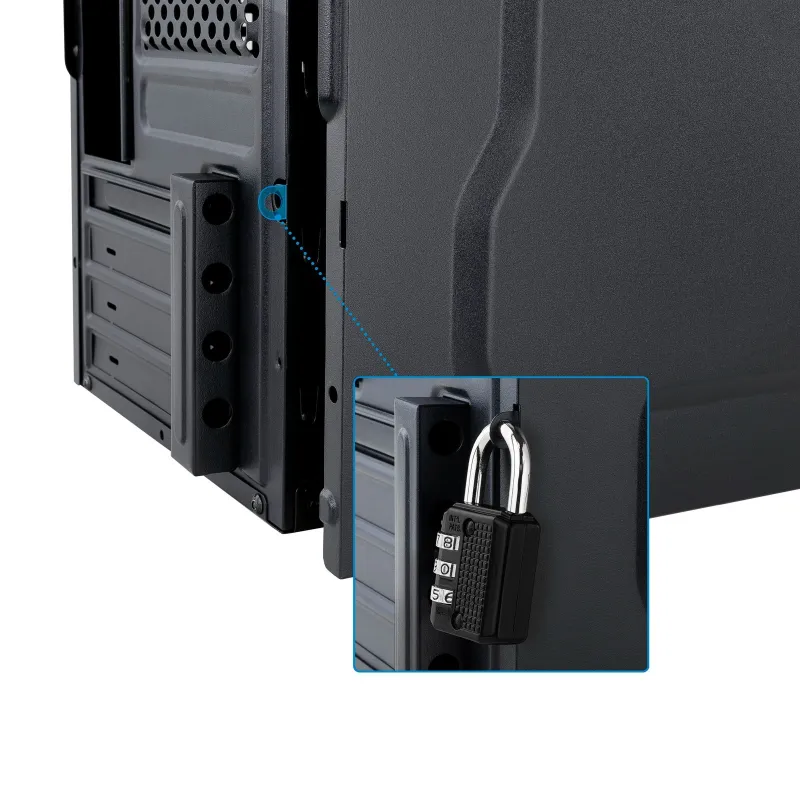Este PC de tipo Mini Tower destaca por su elegante diseño en color negro y su construcción en material SECC. Compatible con tarjetas madre micro ATX, ofrece una excelente capacidad de expansión con 4 puertos de 3.5", 1 puerto de 5.25" y 1 bahía de 2.5", además de 3 bahías internas de 3.5". Aunque no cuenta con ventana lateral ni altavoces incorporados, permite un manejo eficiente y organizado de componentes.