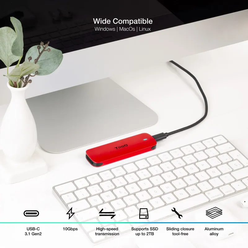 Equipada con conexión USB 3.2 Gen 2 y un conector USB Tipo C, proporciona una conexión rápida y fiable. Su diseño en aluminio de color rojo no solo le confiere un aspecto elegante, sino que también garantiza durabilidad y resistencia. Además, los indicadores LED permiten un monitoreo fácil del estado del dispositivo.