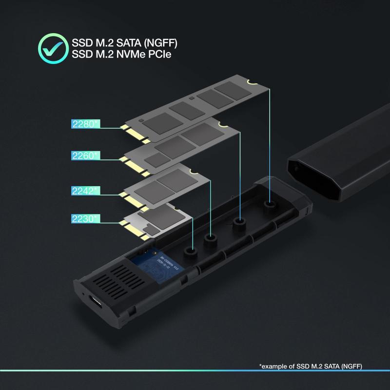 - Compatible con M.2 NGFF y NVMe PCIe 2230/2242/2260/2280
