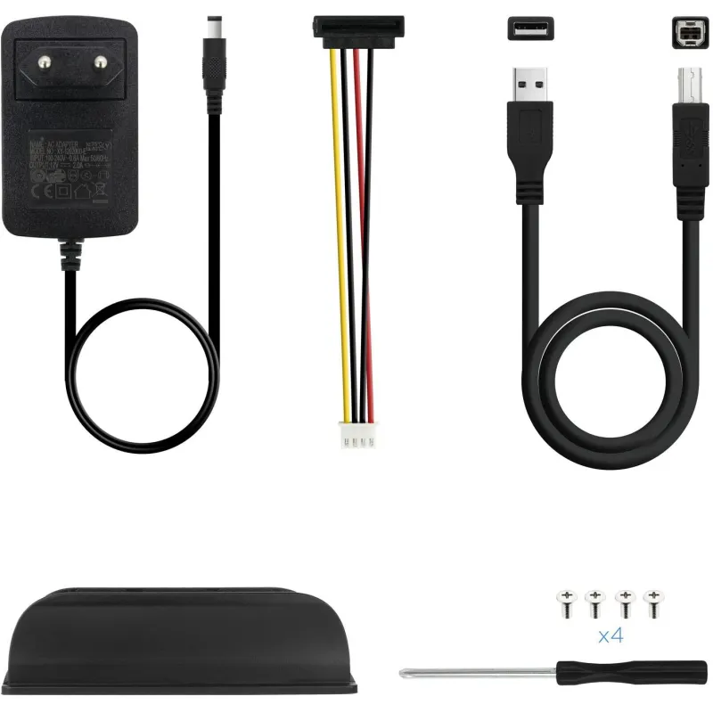 Es compatible con múltiples sistemas de archivos como ext2, FAT32, HFS y NTFS, y se puede usar con Windows, MAC OS y Linux/Ubuntu. Incluye un adaptador de energía externo, cables USB, stand y tornillos, junto con un manual de usuario para una instalación sin complicaciones.