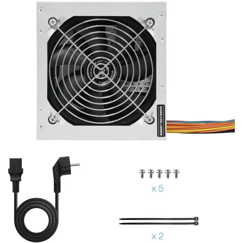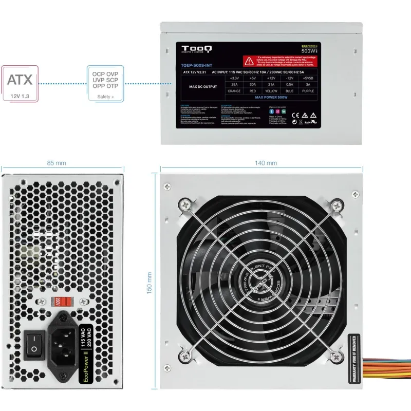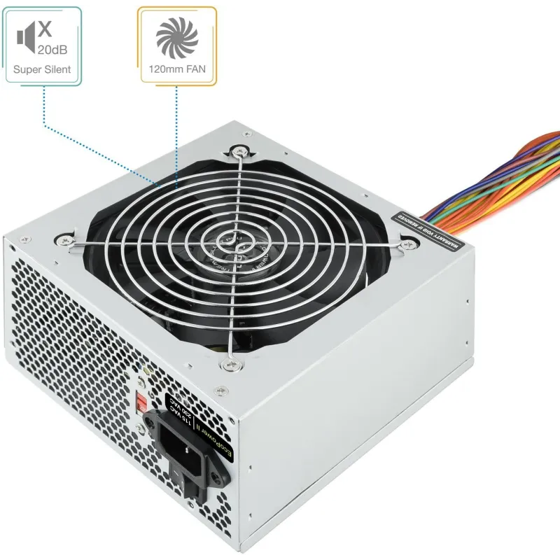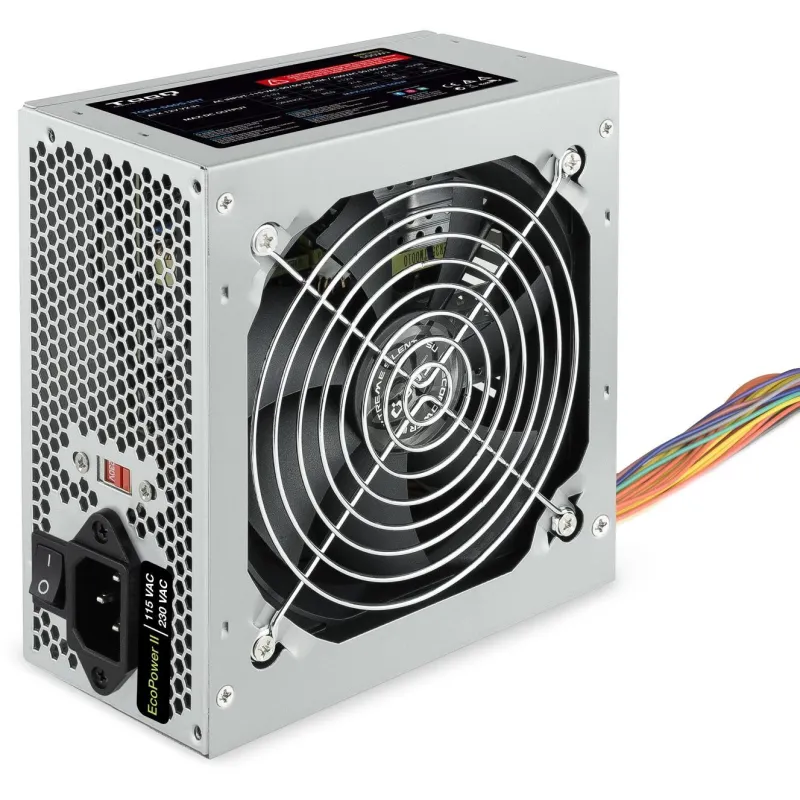 La fuente de alimentación ATX de 500 W ofrece una solución de energía potente y eficiente para tu PC. Funciona con un voltaje de entrada AC de 115 - 230 V y posee un factor de poder de 0,99 con corrección activa del factor de potencia (PFC), garantizando una máxima eficiencia energética.