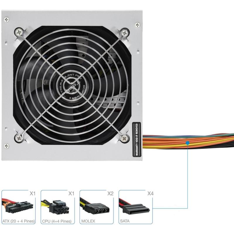 Incluye un alimentador de energía para tarjeta madre de 24-pin ATX, junto con 4 conectores de energía SATA y 2 conectores periféricos (Molex), proporcionando versatilidad para diferentes configuraciones de hardware. Diseñada para su uso en PC, esta fuente de alimentación sigue el estándar ATX con la versión 1.3.