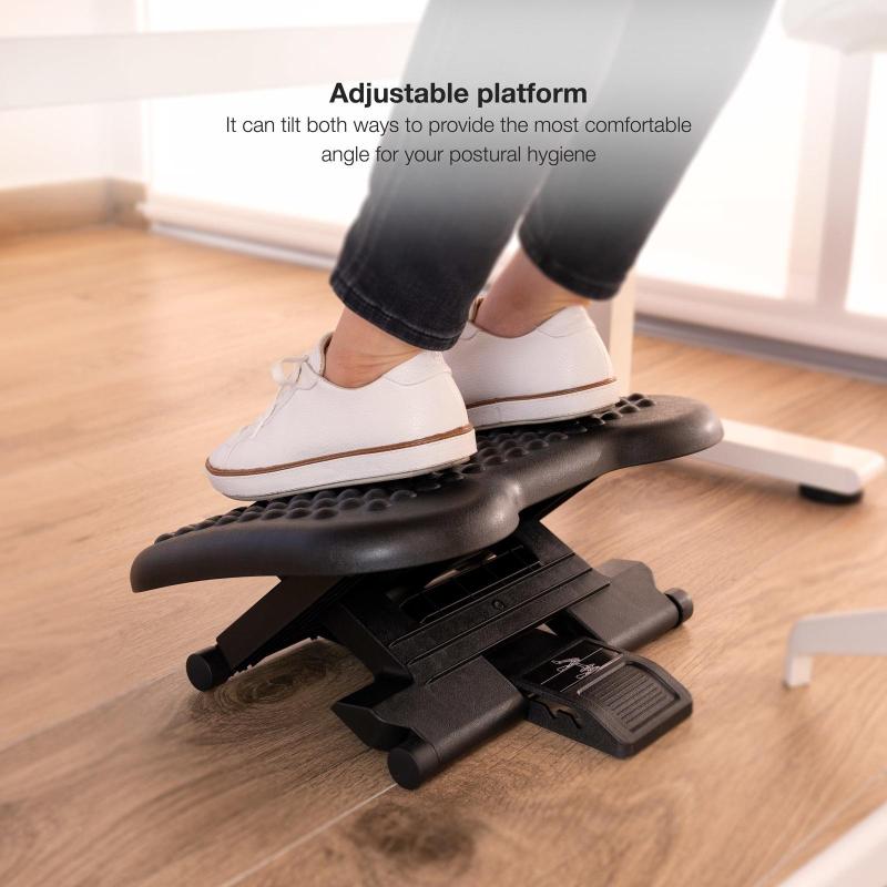 Trabaja cómodamente desde casa o en tu oficina. Nuestro reposapiés te ayudará a mantener tu higiene postural y a conseguir el mayor confort mientras realizas tus tareas diarias. Es completamente plegable y lo podrás regular a tu gusto. Disponible en color negro.
