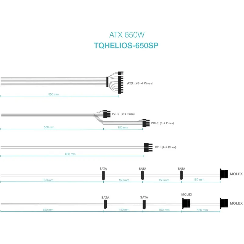 Gracias a sus conectores de energía SATA, esta fuente de alimentación permite conectar hasta cinco dispositivos de almacenamiento como discos duros o unidades SSD. Las longitudes variables de los cables (550, 700, 850 y 1000 mm) ofrecen flexibilidad en la instalación, adaptándose a distintos tamaños de torre y configuraciones internas. La TooQ TQHELIOS-650SP 650W 80 Plus Bronze está pensada para usuarios que necesitan versatilidad y orden en el cableado, facilitando una distribución eficiente de la energía sin complicaciones. Esta característica resulta especialmente útil en montajes personalizados o equipos con múltiples unidades de almacenamiento.