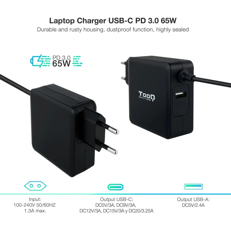 Este cargador está diseñado para su uso con portátiles y ofrece una fuente de alimentación interior, con una conversión de CA a CC. Soporta un rango de voltaje de entrada de 100 V a 240 V, con una frecuencia de 50 / 60 Hz y una corriente de entrada de 1.3 A. La potencia de salida es de 65 W, con un voltaje de salida que varía entre 5 V y 20 V y una corriente de salida de 3,25 A. Dispone de un enchufe Tipo C y un puerto USB.