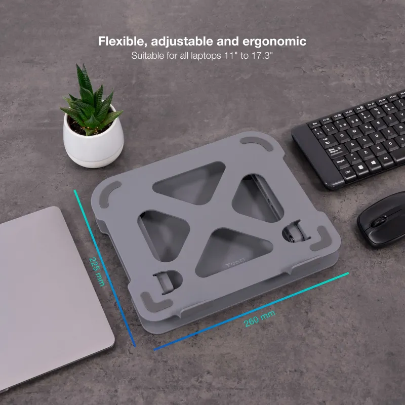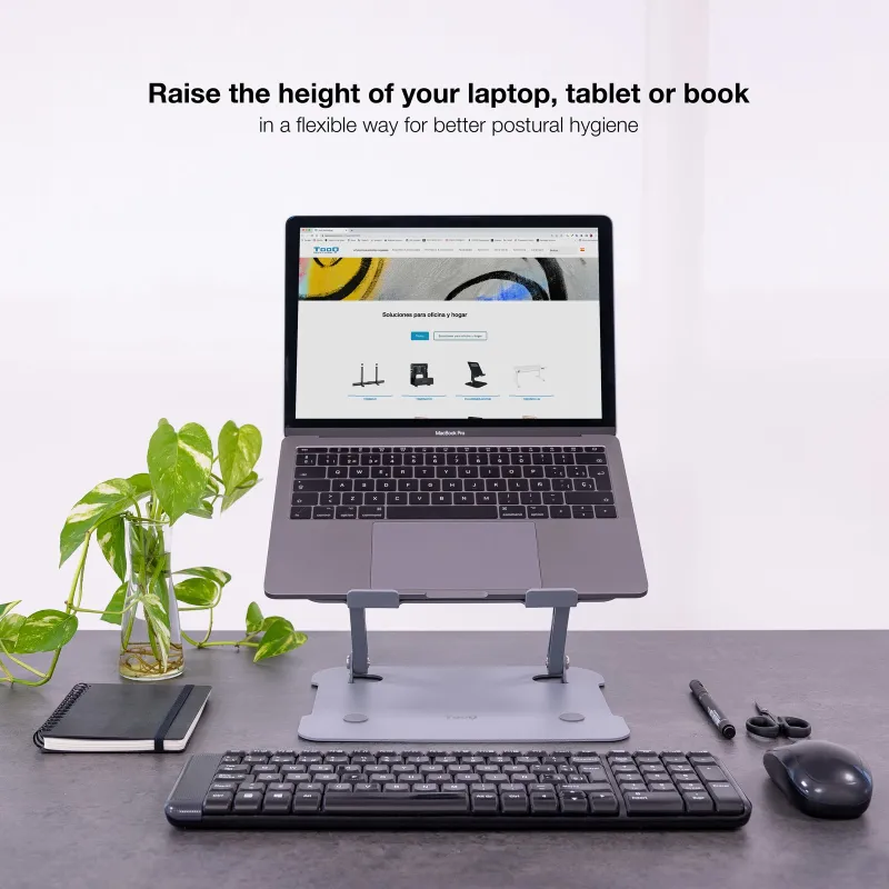 Descubre la mejor forma de elevar un portátil o una tablet. Nuestro soporte TooQ TQLRS0012-AL-G está diseñado para adoptar la mejor posición para mantener una higiene postural óptima, ponte cómodo y trabaja sin tensión. Además, es ligero y plegable lo que te permitirá llevarlo siempre contigo y usarlo en cualquier ocasión.