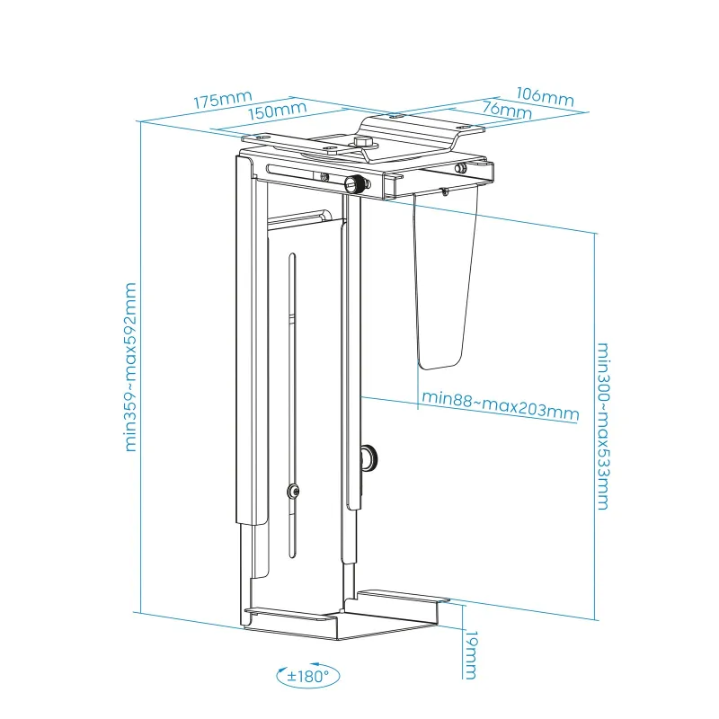 ADAPTABLE A TODO TIPO DE CPU: No te preocupes por el tamaño o el peso de tu CPU. El nuevo soporte para CPU es adaptable a todo tipo de chasis, desde los más pequeños hasta los más grandes. Solo tienes que ajustar el ancho y la altura del soporte según las dimensiones de tu CPU. El soporte tiene un rango de ajuste de anchura de 88 - 203 mm y un rango de ajuste de altura de 300 - 533 mm. Además, tiene una capacidad máxima de peso de 10 kg, por lo que podrás colocar tu CPU con total seguridad.