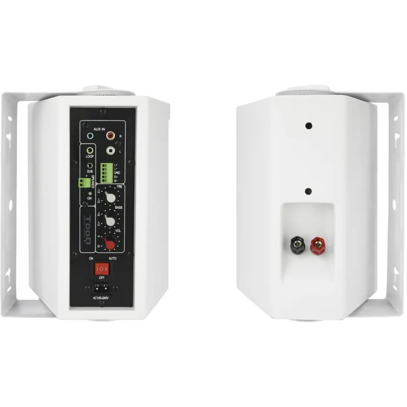 En un elegante color blanco, incluyen control de volumen giratorio, ajuste de bajos y agudos, e indicadores LED, ofreciendo una experiencia de usuario intuitiva y personalizada. Además, cuentan con un interruptor de encendido/apagado integrado para mayor comodidad.