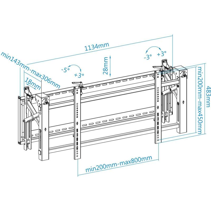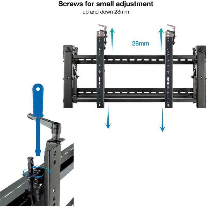Este soporte cuenta con una amplia gama de ajustes ergonómicos para garantizar una experiencia de visualización óptima. Es posible realizar ajustes de altura de forma manual, con un rango de hasta 28 mm, y también ajustar la inclinación entre -5° y 3°, lo que permite adaptar la posición del televisor según las necesidades del usuario. Además, incluye la capacidad de giro con un ángulo de -3° a 3°, ofreciendo una flexibilidad adicional para una visión perfecta desde cualquier ángulo.